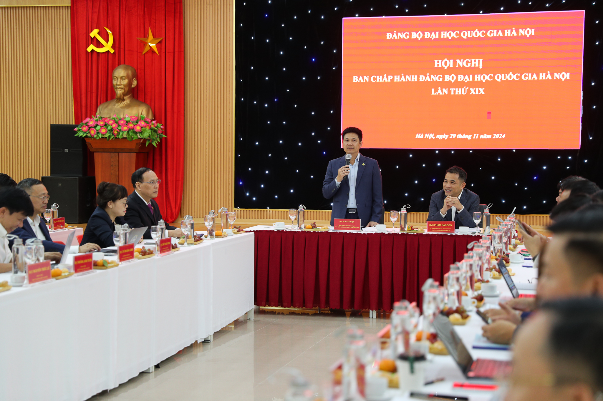 Phó Bí thư Thường trực Đảng ủy Nguyễn Hiệu nhấn mạnh, mỗi Đảng ủy viên trong Ban Chấp hành Đảng bộ ĐHQGHN cần quán triệt tinh thần tinh gọn, mạnh, hiệu quả để đột phá vươn mình trong kỷ nguyên mới trong đó con người, công nghệ là yếu tố then chốt để phát triển ĐHQGHN vững mạnh vươn tầm thế giới.