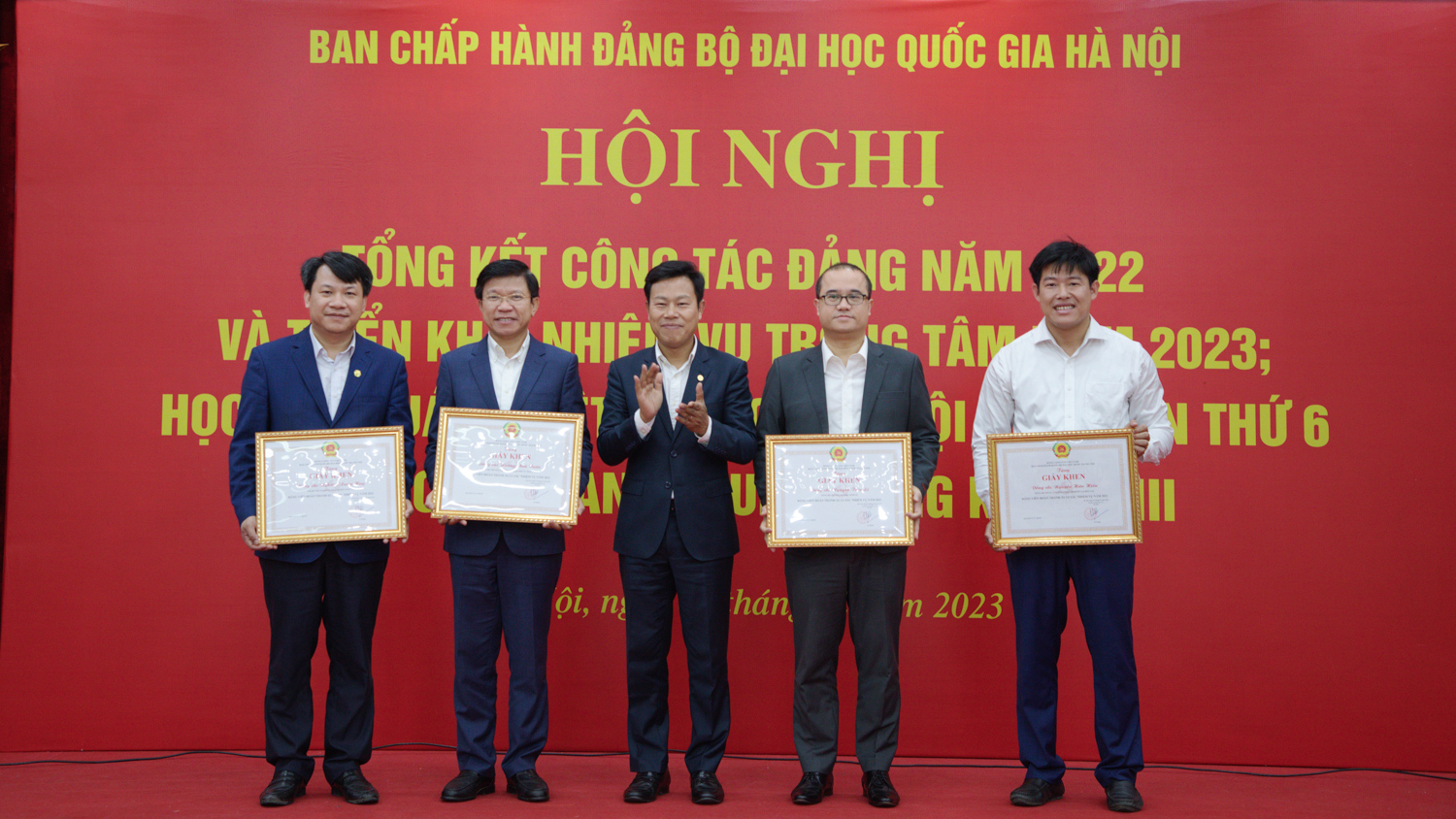 Cũng trong khuôn khổ hội nghị, Ban Thường vụ Đảng ủy ĐHQGHN đã trao giấy khen của Đảng ủy ĐHQGHN cho các tổ chức đảng, đảng viên có thành tích xuất sắc trong năm 2022 vừa qua.