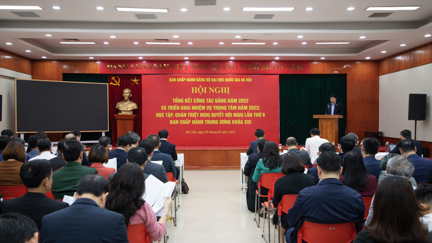 Tại hội nghị, Phó Bí thư Đảng ủy, Phó Giám đốc ĐHQGHN Nguyễn Hiệu đã trình bày Báo cáo tổng kết công tác xây dựng Đảng năm 2022 và triển khai nhiệm vụ trọng tâm năm 2023 của Đảng bộ ĐHQGHN.