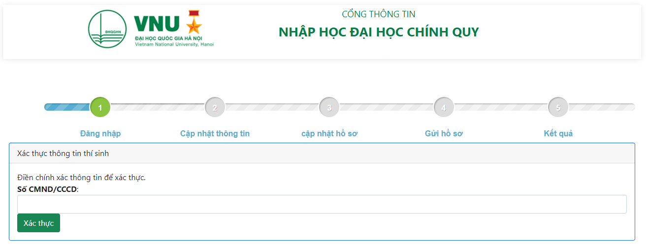Bước 2: Thí sinh đăng nhập vào địa chỉ tuyensinh.vnu.edu.vn mục “Nhập học” để điền thông tin xác thực theo giao diện hướng dẫn dưới đây: