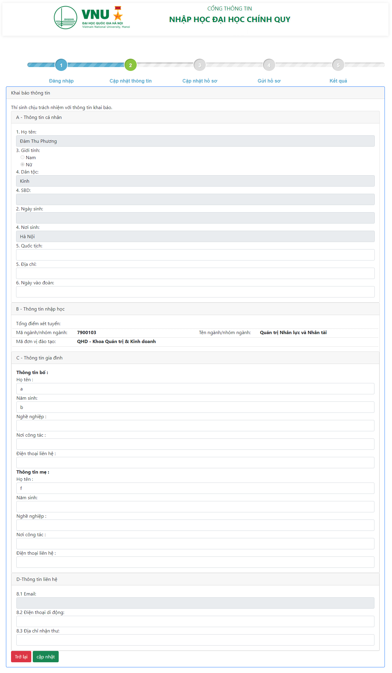 Bước 3: Thí sinh cập nhật thông tin cá nhân (Họ và tên, giới tính, ngày sinh, nơi sinh, quốc tịch, dân tộc, địa chỉ, ngày vào đoàn), Thông tin gia đình, Thông tin liên hệ như hướng dẫn tại giao diện dưới đây: