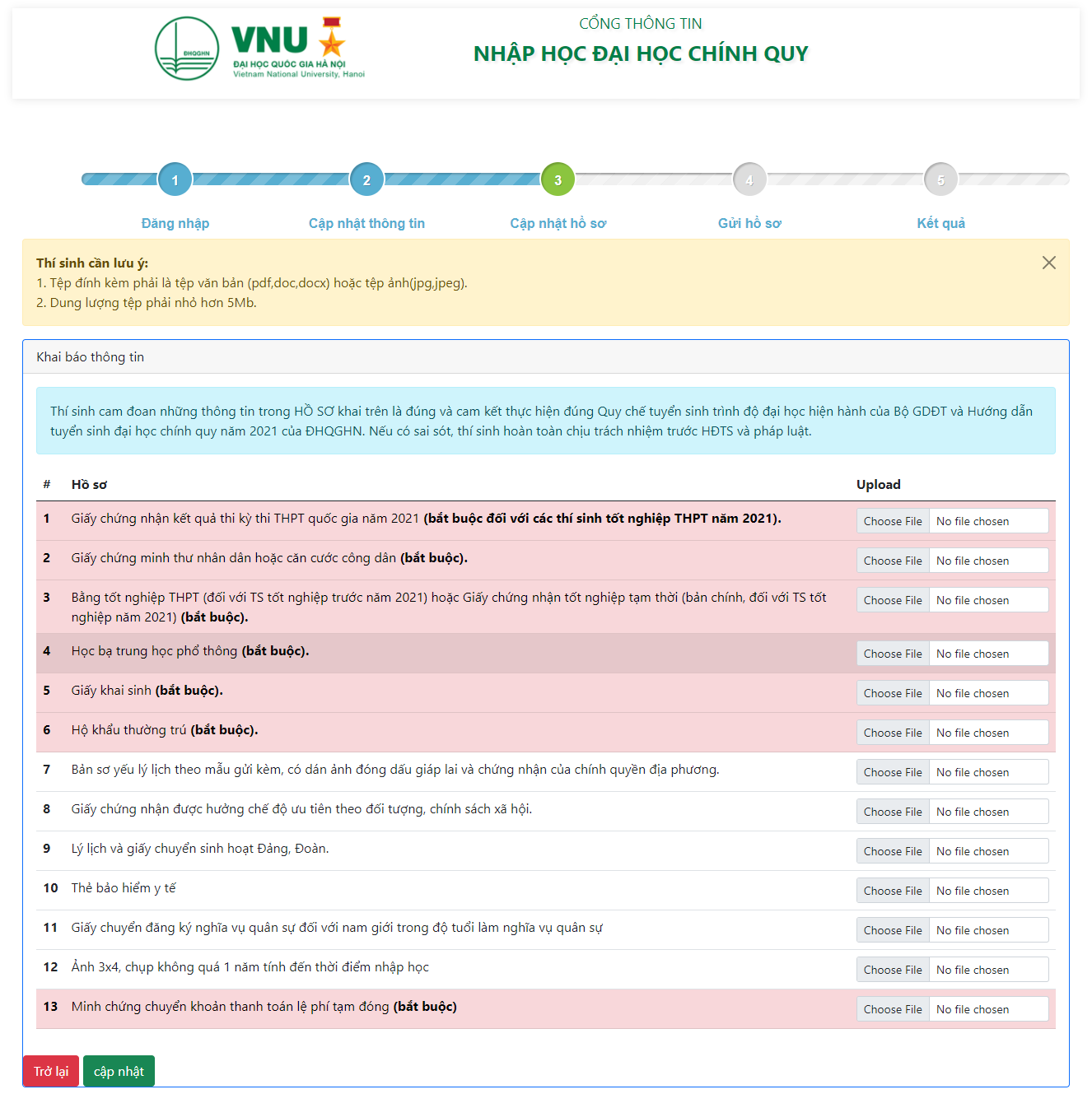 Bước 4: Cập nhật hồ sơ nhập học: Thí sinh đọc kỹ hướng dẫn trước khi cập nhật hồ sơ: (1) Tệp đính kèm phải là tệp văn bản (pdf, doc, docx) hoặc tệp ảnh (jpg, jpeg); (2) Dung lượng tệp phải nhỏ hơn 20Mb và tải lần lượt từng lên hồ sơ nhập học lên Cổng thông tin Rà soát thật kỹ trước khi bấm nútcập nhật.