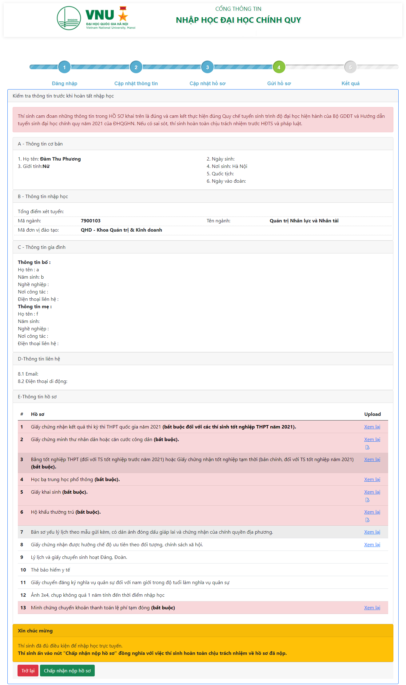 Bước 5: Gửi hồ sơ nhập học: Thí sinh cần kiểm tra, rà soát thật kỹ thông tin trước bấm nút Chấp nhận nộp hồ sơ nhập học trực tuyến.