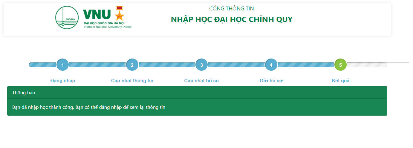 Ngay sau khi thí sinh bấm chấp nhận nộp hồ sơ, màn hình sẽ hiển thị thông báo: “Bạn đã nhập học thành công”.