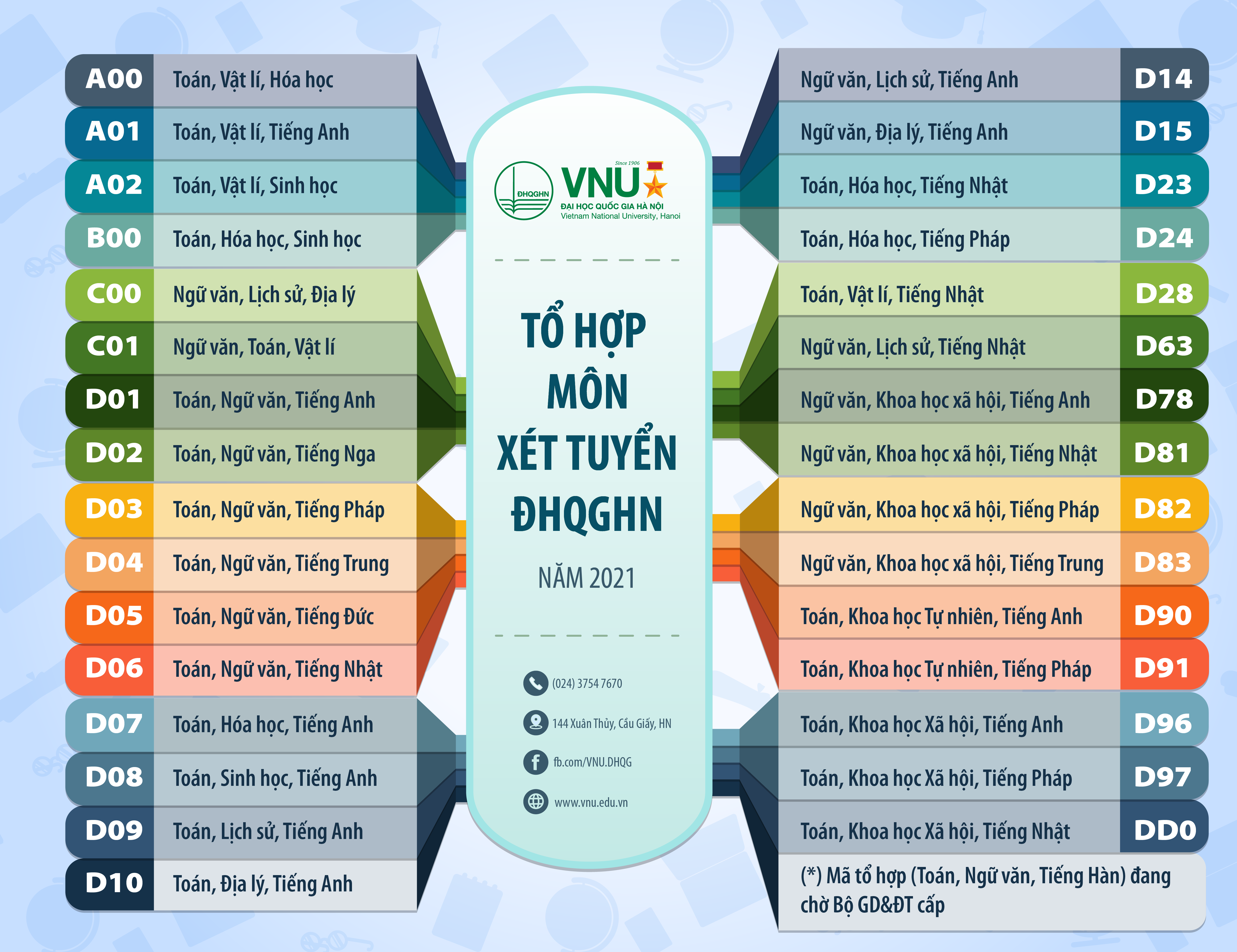 Năm 2021, thí sinh có thể đăng ký xét tuyển vào các ngành đào tạo của ĐHQGHN bằng các tổ hợp môn xét tuyển.