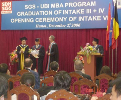 Tham dự buổi lễ có ngài Phillippe Jottard - Đại sứ Vương quốc Bỉ tại Việt Nam, Giáo sư, Nam tước Francois d’Anethan - Viện trưởng Viện quản trị Kinh doanh Brussels, ngài Lucien Van Dievoet - Giám đốc Viện quản trị Kinh doanh Brussels, GS. Tôn Thất Nguyễn Thiêm - Giám đốc các chương trình MBA tại Việt Nam, PGS.TS Phạm Quang Hưng - Phó Giám đốc ĐHQGHN. Cùng dự còn có đông đủ 21 học viên tốt nghiệp khoá III, khoá IV và 16 tân học viên khoá VIII.
