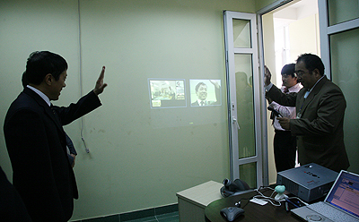 GS. Mai Trọng Nhuận đang giao lưu với văn phòng ĐH Kyoto tại Nhật Bản qua hệ thống video conference của VKCO |