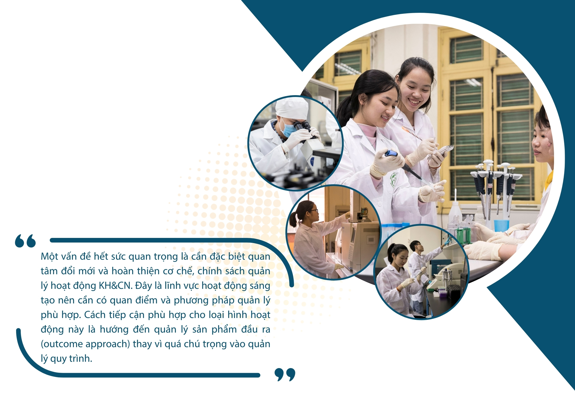 Một vấn đề hết sức quan trọng là cần đặc biệt quan tâm đổi mới và hoàn thiện cơ chế, chính sách quản lý hoạt động KH&CN. Đây là lĩnh vực hoạt động sáng tạo nên cần có quan điểm và phương pháp quản lý phù hợp. Cách tiếp cận phù hợp cho loại hình hoạt động này là hướng đến quản lý sản phẩm đầu ra (outcome approach) thay vì quá chú trọng vào quản lý quy trình.