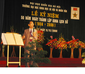 Trong bài diễn văn đọc tại lễ kỷ niệm, PGS.TS KH Nguyễn Hải Kế - Chủ nhiệm Khoa đã nhắc lại những dấu mốc quan trọng trên chặng đường nửa thế kỷ đầy những biến cố thăng, trầm mà các thế hệ cán bộ giảng dạy và sinh viên đã trải qua để đưa Khoa Lịch sử trở thành một trung tâm đào tạo - nghiên cứu lớn, có uy tín trong nước và quốc tế.