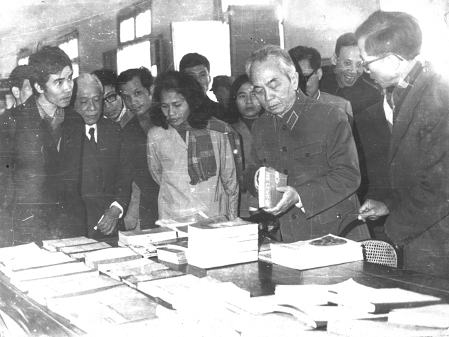 Đại tướng Võ Nguyên Giáp đến thăm và làm việc với Trường Đại học Tổng hợp Hà Nội, người đi phía sau bên trái Đại tướng là Giáo sư, Hiệu trưởng Ngụy Như Kontum (Ảnh: tư liệu). Cán bộ Trường ĐH Tổng hợp Hà Nội giới thiệu với Đại tướng hệ thống giáo trình và tài liệu khoa học (ảnh dưới). Ảnh: tư liệu