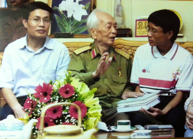Đại tướng đang trò chuyện với GS. Nguyễn Hữu Đức - Phó giám đốc ĐHQGHN lúc đó là Hiệu trưởng Trường Đại học Công nghệ và Nhà Vô địch leo núi Olympia Lê Vũ Hoàng, 2005.