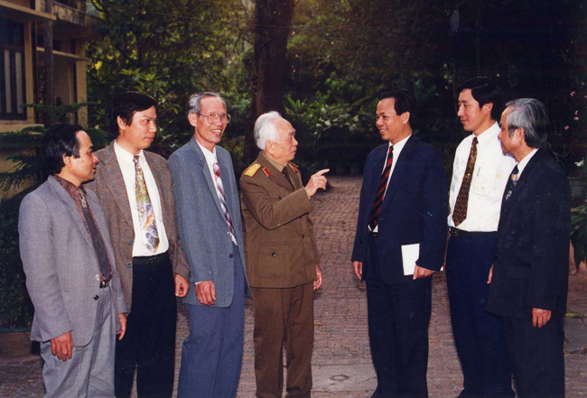 Đại tướng với các Giáo sư Sử học của ĐHQGHN nhân dịp kỷ niệm 50 năm chiến thắng Điện Biên Phủ (1954 - 2004), ảnh từ phải sang: GS. Vũ Minh Giang, GS. Vũ Dương Ninh, Đại tướng Võ Nguyên Giáp, PGS. Phạm Xuân Hằng và GS. Nguyễn Văn Khánh.