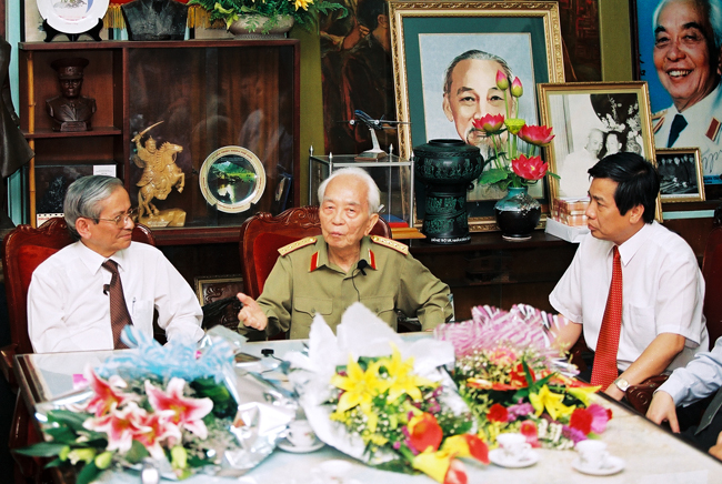 Đại tướng và GS. Phan Huy Lê (bên trái), GS. Vũ Minh Giang - Chủ tịch Hội đồng Khoa học Đào tạo, nguyên Phó giám đốc ĐHQGHN (bên phải), 2004