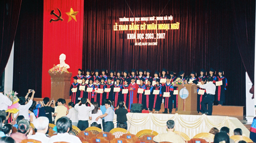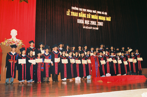 Sinh viên Vũ Hải Hà - thủ khoa ngành tiếng Anh đồng thời là thủ khoa toàn trường đã thay mặt sinh viên khoá 2003 – 2007 phát biểu và tặng hoa thầy Hiệu trưởng.