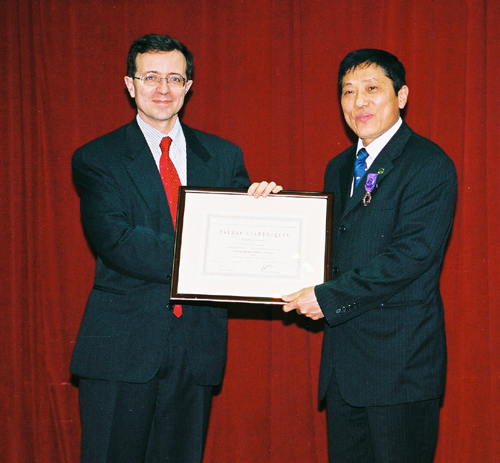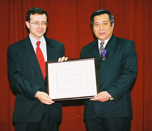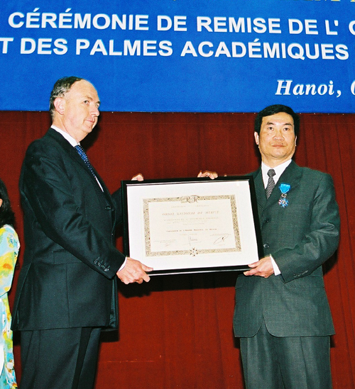 Ngài Jérôme Pasquier - Phó Tổng giám đốc Hợp tác quốc tế và Phát triển Bộ Ngoại giao Pháp trao Huy chương Cành cọ Hàn lâm và bằng chứng nhận có chữ ký của Thủ tướng CH Pháp cho GS. TSKH Vũ Minh Giang |