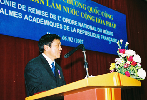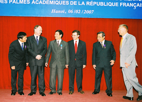Tiếp đó, Ngài Jérôme Pasquier - Phó Tổng giám đốc Hợp tác quốc tế và Phát triển Bộ Ngoại giao Pháp đã phát biểu và trao tặng Cành cọ Hàn lâm, phần thưởng lâu đời nhất và có uy tín nhất của nước Cộng hoà Pháp, cho GS.TSKH Vũ Minh Giang và GS.TS Mai Trọng Nhuận - Phó giám đốc ĐHQGHN.