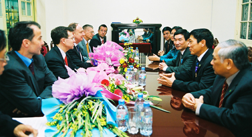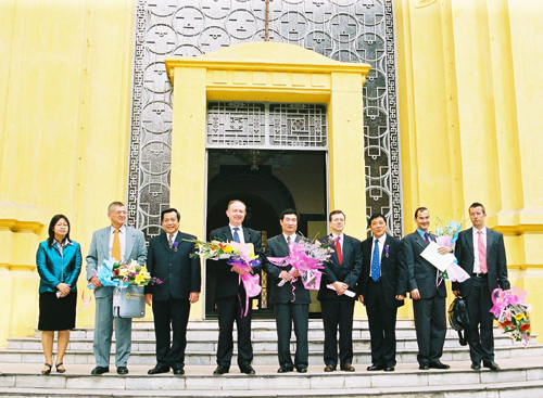 Ảnh từ trái sang: GS.TS Mai Trọng Nhuận, Ngài Jean Francois Blarel, GS.VS Đào Trọng Thi, Ngài Jérôme Pasquier, GS.TSKH Vũ Minh Giang và Ngài Alain Freynel. |