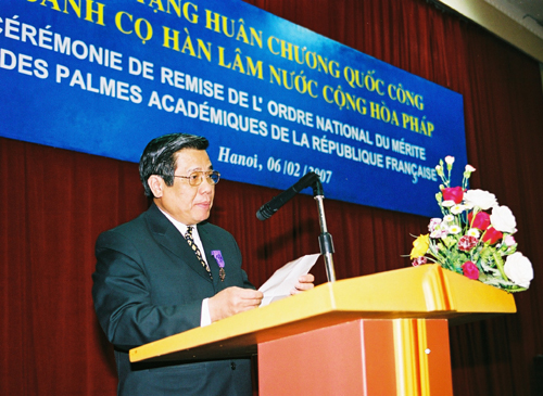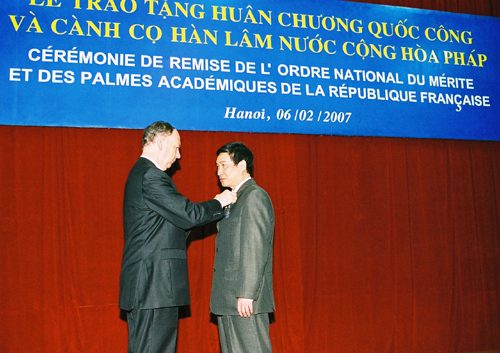 Ngài Jean Francois Blarel Đại sứ Cộng hoà Pháp tại Việt Nam trao bằng chứng nhận Huân chương Quốc công có chữ ký ký của Tổng thống Pháp cho GS.VS Đào Trọng Thi |