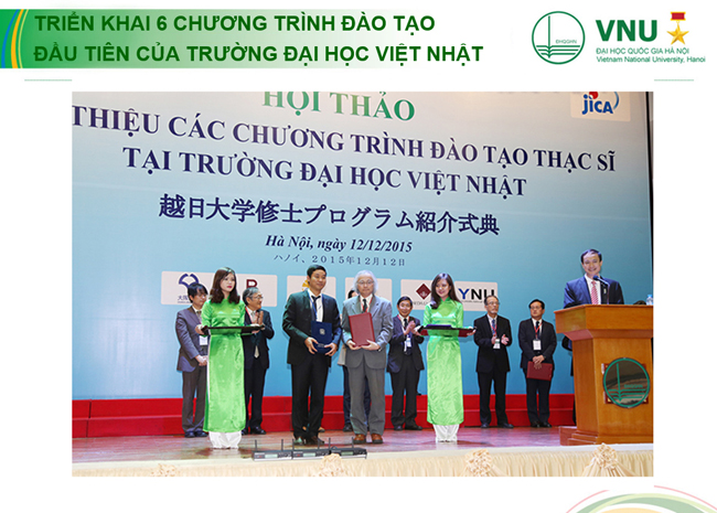 ĐHQGHN đã phối hợp với 15 trường đại học hàng đầu của Nhật Bản tổ chức xây dựng các chương trình đào tạo cho Trường ĐH Việt Nhật, trước hết là tập trung vào 06 chương trình đào tạo thạc sỹ để tổ chức khai giảng vào mùa thu năm 2016. Sáu chương trình gồm: Công nghệ nano, Kỹ thuật môi trường, Kỹ thuật hạ tầng, Khu vực học, Chính sách công và Quản trị kinh doanh. Đây là các chương trình đào tạo cùng hướng tới mục tiêu đào tạo nguồn nhân lực chất lượng cao, được chuyển giao công nghệ đào tạo từ các trường đại học danh tiếng của Nhật Bản như ĐH Tokyo, ĐH Osaka, ĐH Tsukuba, ĐH Quốc gia Yokohama, ĐH Waseda, ĐH Ritsumeikan... và có sự điều chỉnh ở mức độ nhất định cho phù hợp với điều kiện của Việt Nam.