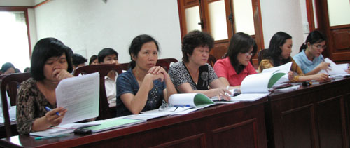 Các đại biểu dự hội nghị đang xem xét, thảo luận văn bản hướng dẫn mới |