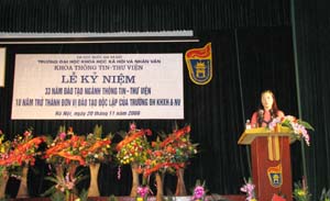 Sáng 20/11, Khoa Thông tin - Thư viện, Trường ĐHKHXH&NV (ĐHQGHN) đã tổ chức lễ kỷ niệm “33 năm đào tạo ngành Thông tin - Thư viện, 10 năm trở thành đơn vị đào tạo độc lập của Trường ĐHKHXH&NV”. Tham dự có đông đảo thế hệ các cán bộ, giảng viên, sinh viên đã và đang công tác, học tập tại Khoa.
