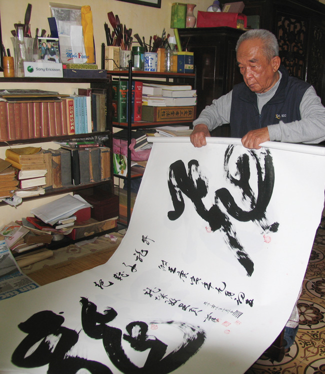 Bước vào phòng của “ông già viết chữ thành Thăng Long”, nhiều người không khỏi ngỡ ngàng trước những bức thư pháp đẹp và ý nghĩa, đủ các kích cỡ khác nhau. Đáng chú ý là những bức thư pháp cỡ đại như: chữ “Thanh tịnh”; “Bình Ngô đại cáo”; “Lạc thiện đồng nhân”; “Nam quốc Sơn Hà”; “Thiên tải nhất thì”…viết trên nhiều nền khác nhau, bao khung gỗ chạm khắc tinh xảo, lồng kính được treo ở vị trí trang trọng nhất trong tư gia. Khi được hỏi về ý nghĩa của những bức thư pháp trên, cụ Bách lý giải: “Những bức thư pháp treo trong phòng với tôi đó như phép sống đắc nhân tâm giữa đời thực, tự răn mình sống không màng danh lợi, chỉ vui với niềm vui chung của nhân gian”.