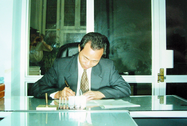 GS. Nguyễn Văn Đạo đang ký những quyết định đầu tiên về công tác tổ chức, nhân sự sau khi nhận con dấu của ĐHQGHN