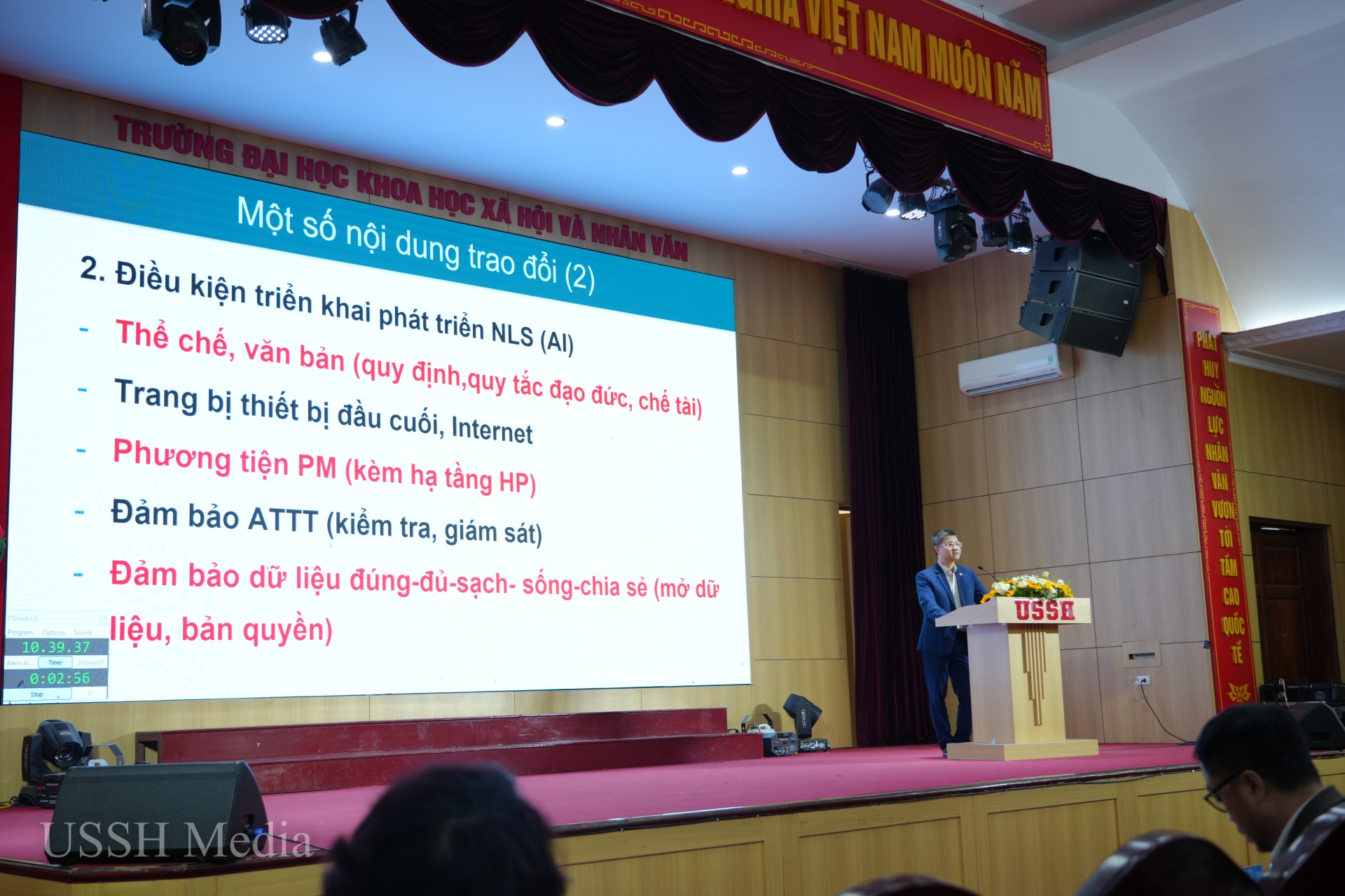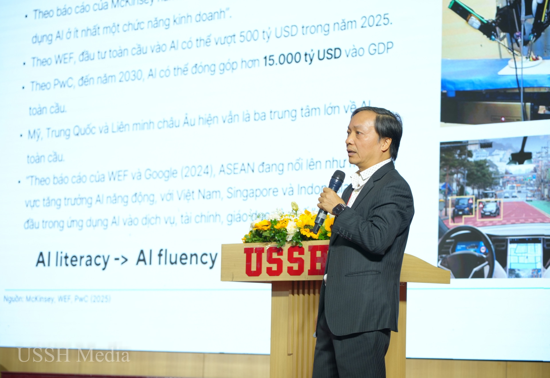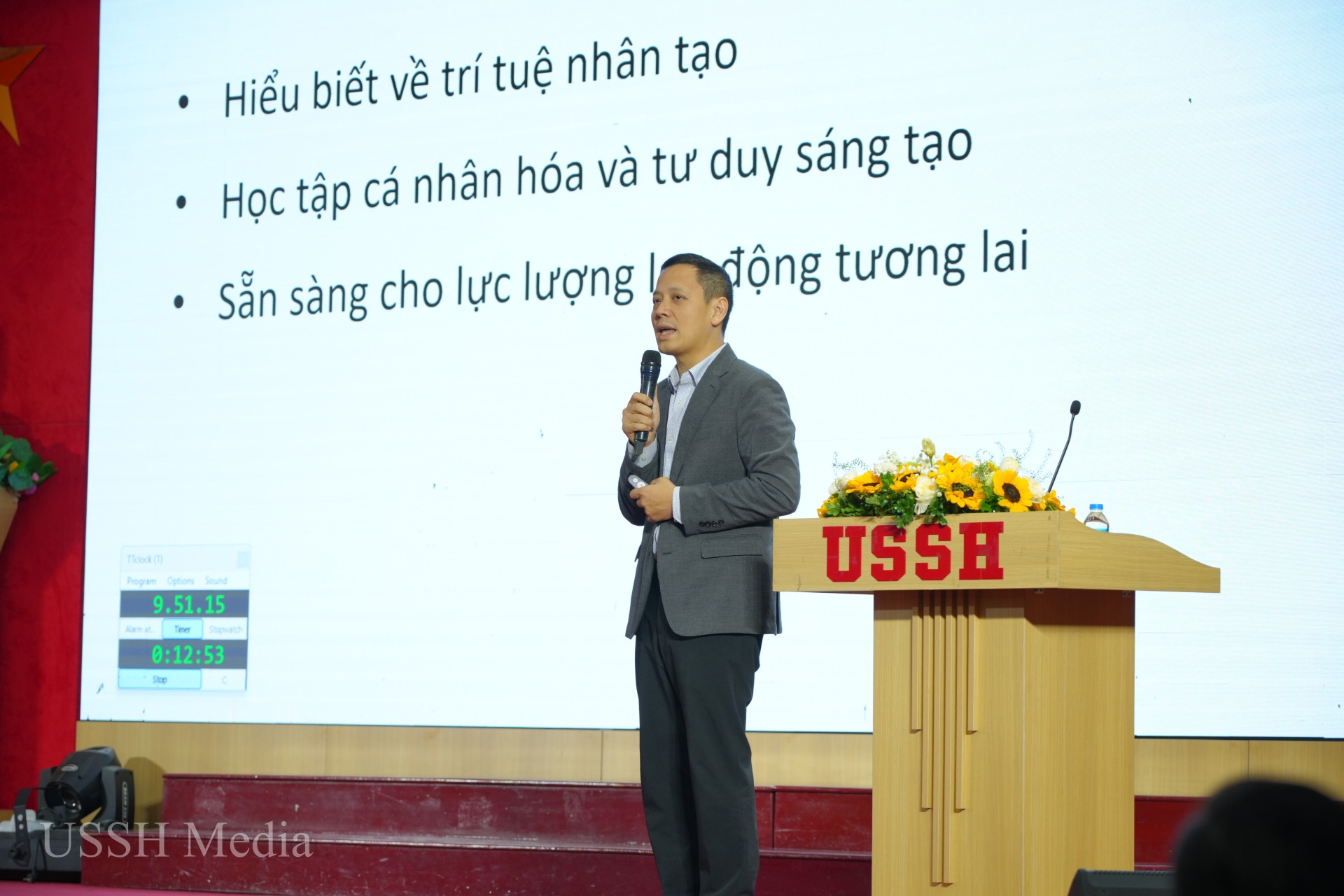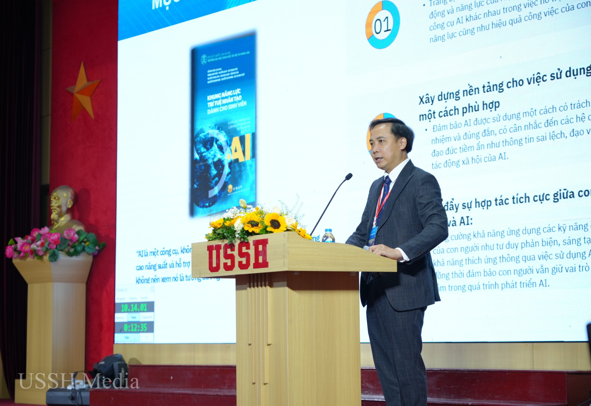 | PGS.TS. Đỗ Văn Hùng - Trưởng Khoa Thông tin - Thư viện, Trường Đại học KHXH&NV, ĐHQGHN trình bày tham luận với chủ đề “Phát triển năng lực AI cho sinh viên đại học: Tư duy phản biện, nghiên cứu và sáng tạo” |