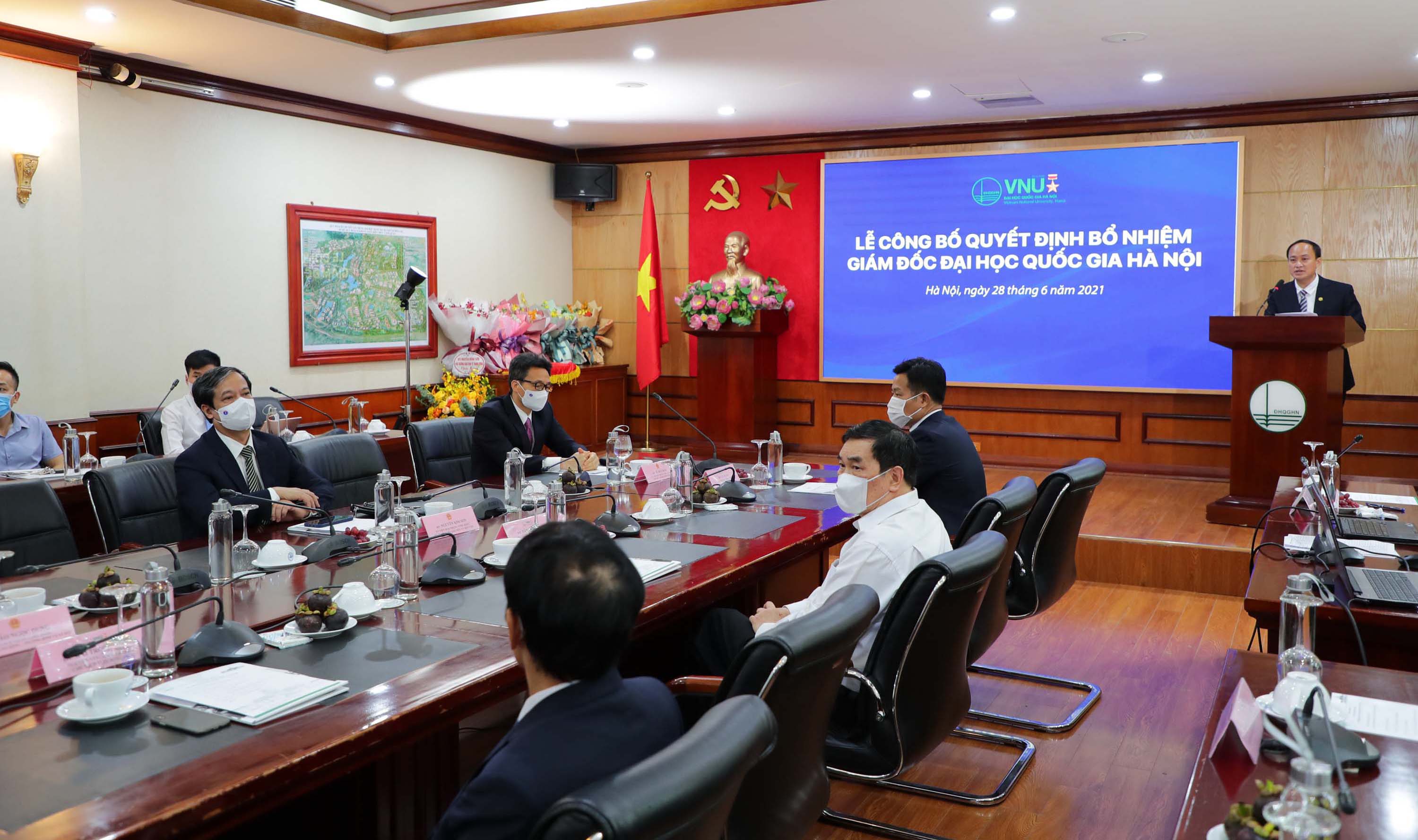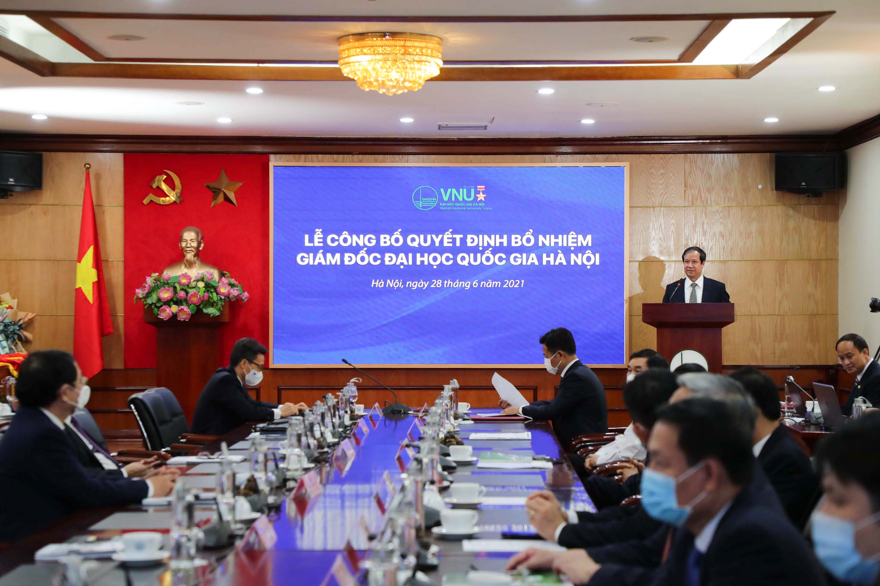 Do diễn biến phức tạp của dịch COVID-19, lễ trao quyết định bổ nhiệm tân Giám đốc ĐHQGHN được tổ chức theo hình thức trực tuyến tại ĐHQGHN và các đầu cầu: ĐHQG Tp. Hồ Chí Minh, UBND tỉnh Cà Mau và các ban chức năng, các đơn vị thành viên, trực thuộc ĐHQGHN.