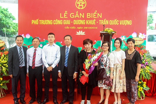 Gia đình GS. Trần Quốc Vượng và đại diện Trường ĐH Khoa học Xã hội và Nhân văn tại lễ gắn biển tên đường, ngày 28/10/2016