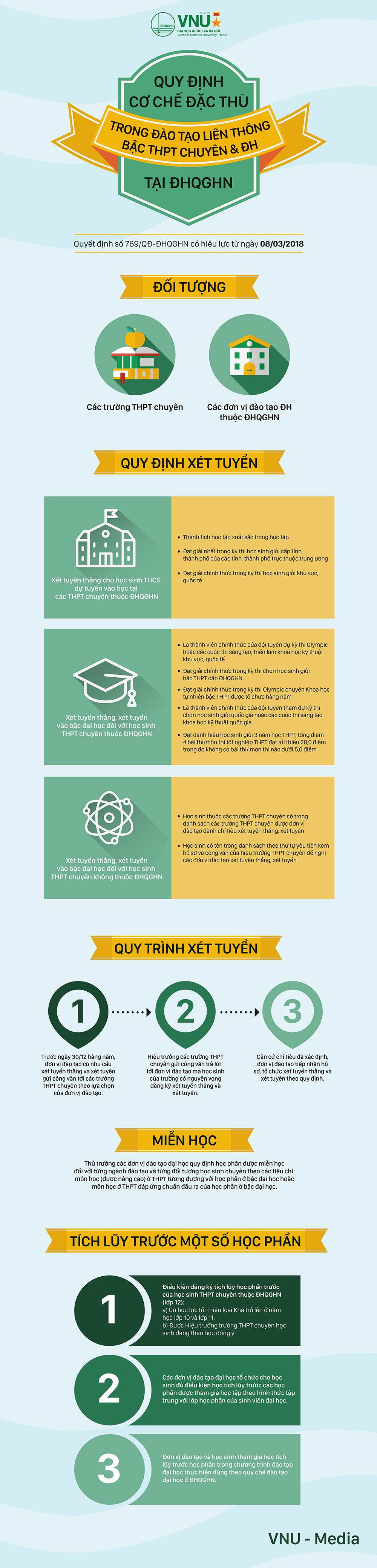 Ngày 8/3/2018, Giám đốc ĐHQGHN đã ký ban hành Quyết định số 769/QĐ-ĐHQGHN về việc Ban hành Quy định cơ chế đặc thù trong đào tạo liên thông bậc THPT chuyên và bậc ĐH tại ĐHQGHN.