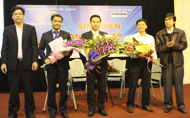 Giám đốc trung tâm Hỗ trợ Sinh viên ĐHQGHN Hoàng Trọng Nghĩa ( bìa trái) và Tổng biên tập Báo Sinh viên Việt Nam Nguyễn Viết Lộc (bìa phải) tặng hoa cho đại diện lãnh đạo của các doanh nghiệp tham gia đối thoại