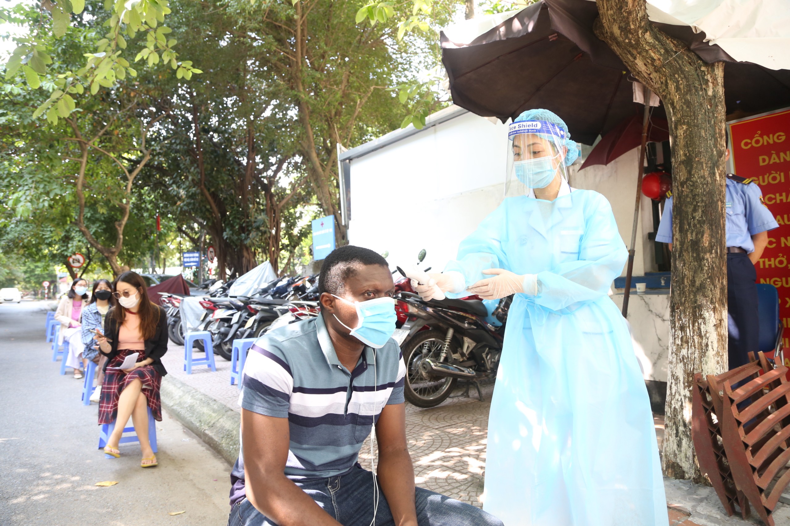 Kuajoh Fabrice, quốc tịch Togo, học viên của Viện Quốc tế Pháp ngữ, Đại học Quốc gia Hà Nội, đang được lấy mẫu xét nghiệm Covid-19 trước khi tiến hành tiêm vaccin phòng chống Covid-19
