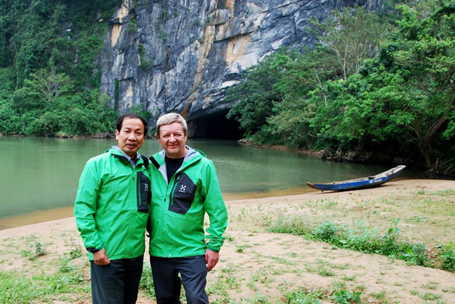 PGS. Ta Hòa Phương cùng ông Howard Limbert - trưởng nhóm nghiên cứu thuộc Hiệp hội Hang động Hoàng gia Anh trước cửa động Phong Nha (ảnh do THP cung cấp).