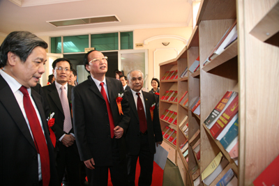 Đồng chí Tô Huy Rứa tham quan khu vực trưng bày các tài liệu sách báo về Đảng CSVN |