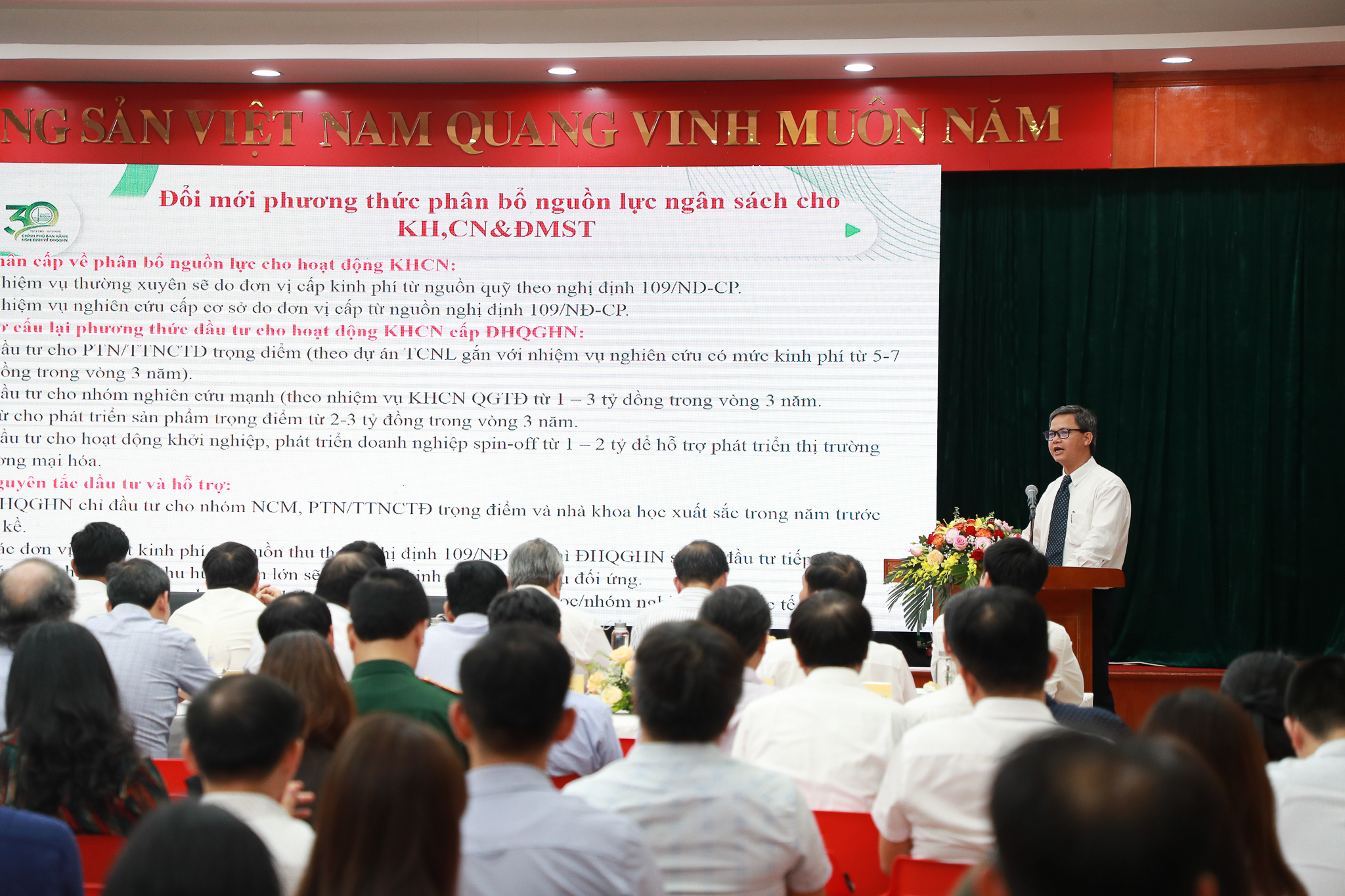 Ông cũng cho rằng, cần tiếp tục đổi mới cơ chế quản lý hoạt động KH&CN theo hướng chú trọng hiệu quả và tác động của nhiệm vụ KH&CN trong giải quyết các bài toán thực tiễn phát triển kinh tế - xã hội của đất nước. Chú trọng chất lượng và chỉ số tác động của các bài báo, công trình công bố quốc tế; khả năng ứng dụng và thương mại hóa kết quả KH&CN trong đời sống công nghiệp và xã hội; khuyến khích công bố quốc tế trong lĩnh vực khoa học xã hội và nhân văn. Cho phép thử nghiệm chính sách mới (Regulatory Sandbox)thúc đẩy ứng dụng các sáng kiến, mô hình đổi mới sáng tạo và công nghệ mới.