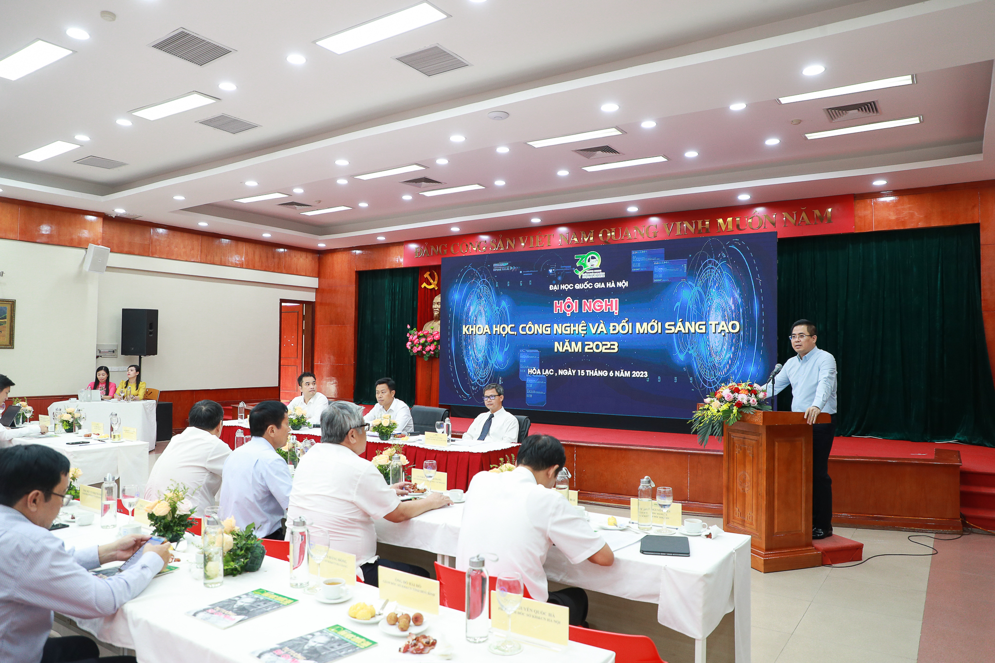 Phát biểu khai mạc, Giám đốc ĐHQGHN Lê Quân nhấn mạnh, năm 2023 được ĐHQGHN xác định là năm đột phá về hoạt động KH&CN. Bên cạnh những chính sách về KH&CN đã ban hành và triển khai trong thời gian qua, ĐHQGHN tập trung phát triển các nghiên cứu ứng dụng, chuyển giao và thương mại hóa sản phẩm KH&CN, tháo gỡ vướng mắc về việc thành lập doanh nghiệp KH&CN. Với định hướng phát triển KHCN tạo động lực gia tăng các chỉ số phát triển bền vững, ĐHQGHN đã ban hành nhiều cơ chế, chính sách trọng dụng, đãi ngộ các nhà khoa học, tạo động lực thúc đẩy phát triển các tiềm lực KHCN và đổi mới sáng tạo. Các chính sách của ĐHQGHN đưa ra theo hướng đầu tư tập trung “vun cao”, ưu tiên nguồn lực đầu tư cho các nhóm nghiên cứu có công bố tốt và các chương trình/đề tài KHCN trọng điểm quốc gia. Định hướng phát triển hệ thống phòng thí nghiệm liên ngành đã và đang được tăng cường, đặc biệt là chiến lược phát triển hệ thống phòng thí nghiệm liên ngành tại Khu 22,9 ha ở Hòa Lạc để đổi mới việc tổ chức nghiên cứu gắn với nhu cầu của doanh nghiệp, hướng tới tạo ra các nghiên cứu tham gia giải quyết các vấn đề lớn của đất nước và các sản phẩm KH&CN ứng dụng trong thực tiễn.