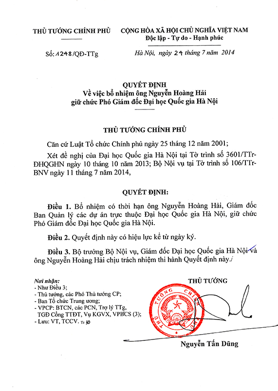 Tân Phó Giám đốc ĐHQGHN Nguyễn Hoàng Hải sinh năm 1973, tốt nghiệp Cử nhân Vật lý năm 1994 tại Trường Đại học Tổng hợp Hà Nội (nay là Trường Đại học Khoa học Tự nhiên - ĐHQGHN), Thạc sĩ ngành Khoa học Vật liệu tại Viện Quốc tế đào tạo về Khoa học Vật liệu ITIMS - Việt Nam năm 1996, lấy bằng Tiến sĩ Vật lý của Trường Đại học Grenoble 1 - Cộng hòa Pháp năm 2003, được bổ nhiệm chức danh phó giáo sư năm 2009.