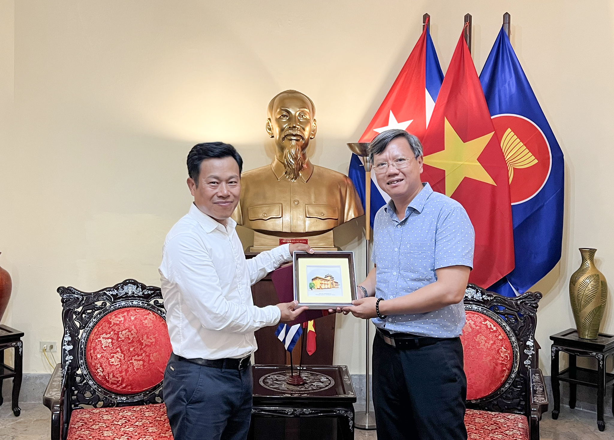 Giám đốc ĐHQGHN Lê Quân trao đổi với ông Lê Quang Long, Đại sứ Đại sứ quán Việt Nam tại Cuba