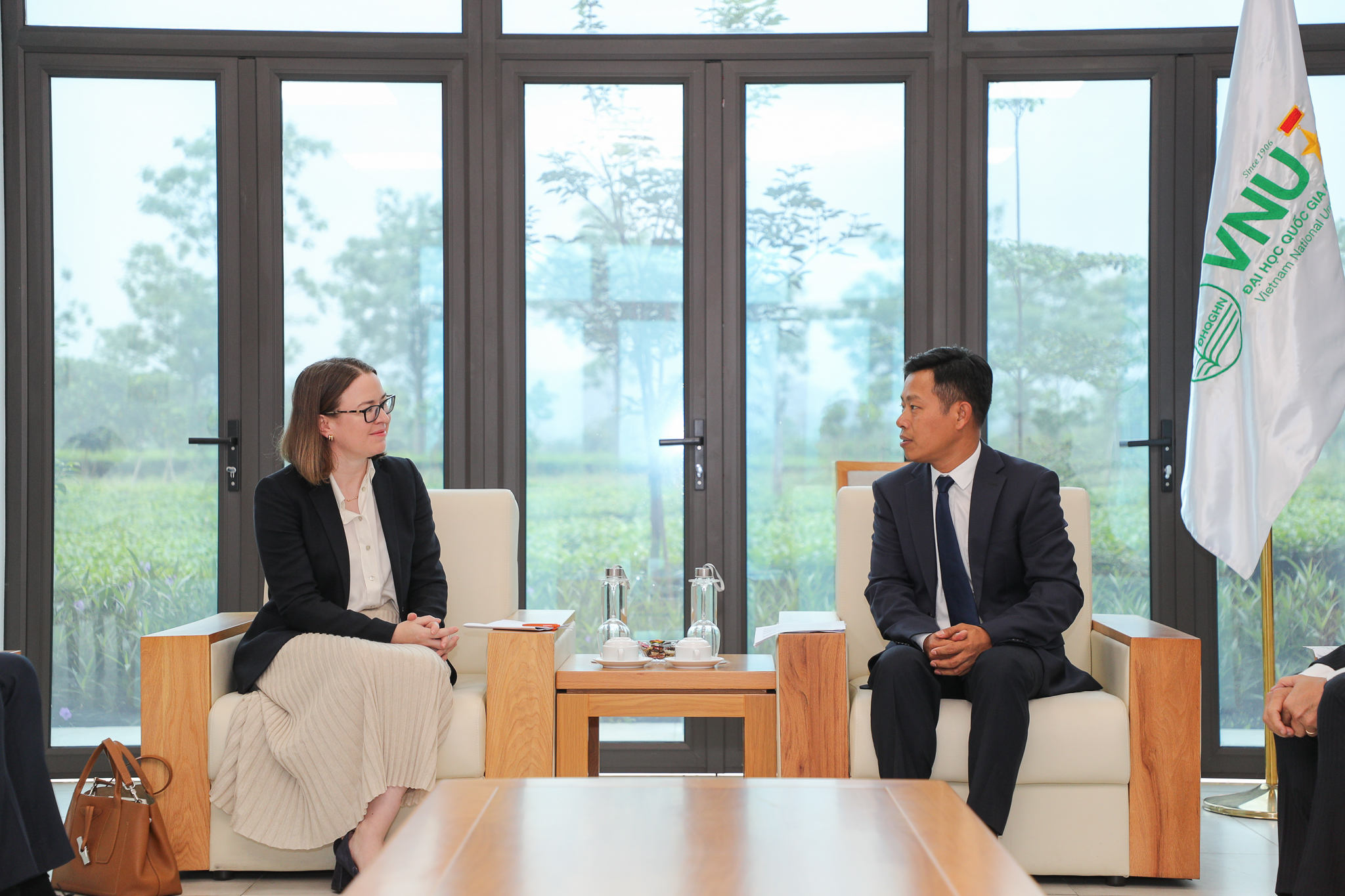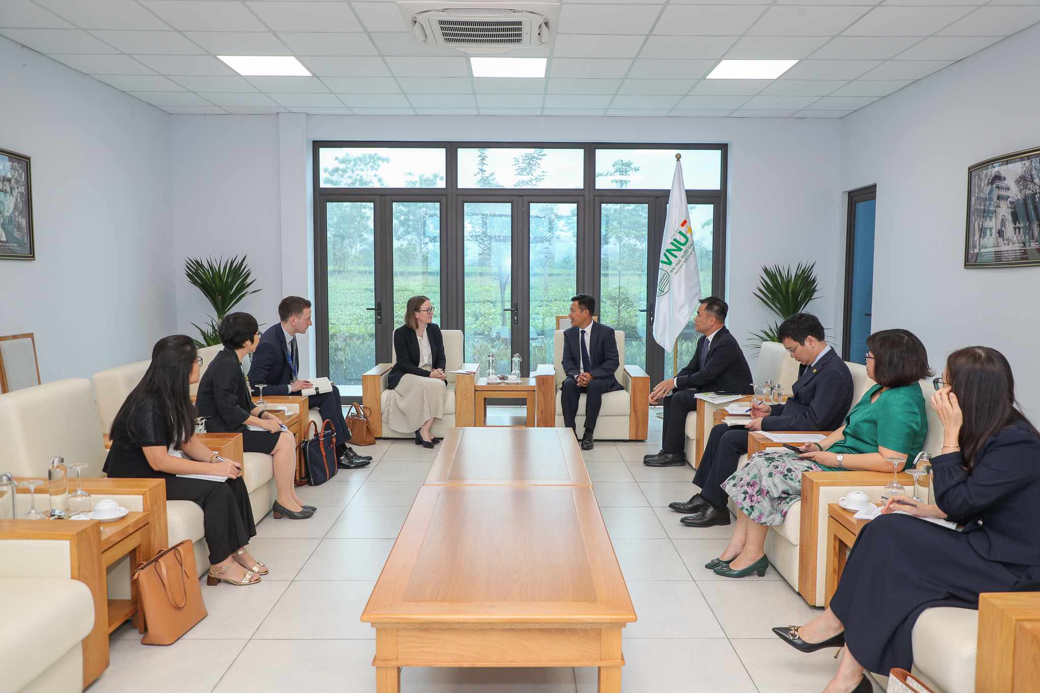 Tại buổi làm việc, Giám đốc Lê Quân gửi lời trân trọng cảm ơn tới Đại sứ quán Ireland vì những kết nối, hỗ trợ ĐHQGHN trong thiết lập và triển khai các hoạt động hợp tác với các cơ sở giáo dục của quốc gia này. ĐHQGHN đã ký thỏa thuận hợp tác song phương với ĐH Dublin, ĐH Trinity, ĐH Cork, Viện Công nghệ Dublin và Pacific Land. Từ năm 2018, ĐHQGHN phối hợp với ĐH Dublin triển khai dự án VIBE về nâng cao năng lực đổi mới sáng tạo và tư duy khởi nghiệp cho cán bộ, giảng viên của ĐHQGHN và lan tỏa đến các cơ sở giáo dục khác trong cả nước. Trong những năm gần đây, hợp tác giữa ĐHQGHN với Đại sứ quán Ireland và các đối tác Ireland phát triển mạnh mẽ, đa dạng và đi vào chiều sâu, thông qua nhiều chương trình trao đổi, hợp tác nâng cao năng lực cán bộ, các dự án về đào tạo và nghiên cứu chung.
