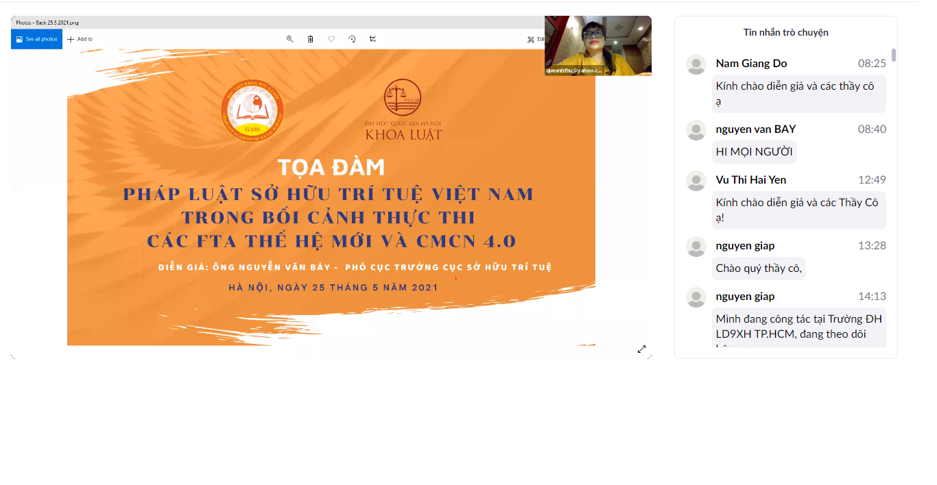 Phát biểu khai mạc, PGS.TS. Nguyễn Thị Quế Anh đã gửi lời chào tới tất cả các đại biểu tham dự Tọa đàm này trên không gian ảo thông qua phần mềm Zoom meeting. Theo PGS, Luật SHTT có 15 năm thực hiện dù khá tương thích với các điều kiện quốc tế tuy nhiên trong bối cảnh CMCN 4.0 và Việt Nam là thành viên của các hiệp định FTA thế hệ mới đã đặt ra yêu cầu tiếp tục hoàn thiện luật SHTT trong thời gian tới. Chủ đề Tọa đàm hôm nay hi vọng chúng ta sẽ cùng thảo luận chuyên sâu về chủ đề sở hữu công nghiệp. Với sự tham gia đông đảo của các đại biểu, PGS đã chúc cho Tọa đàm thành công tốt đẹp.