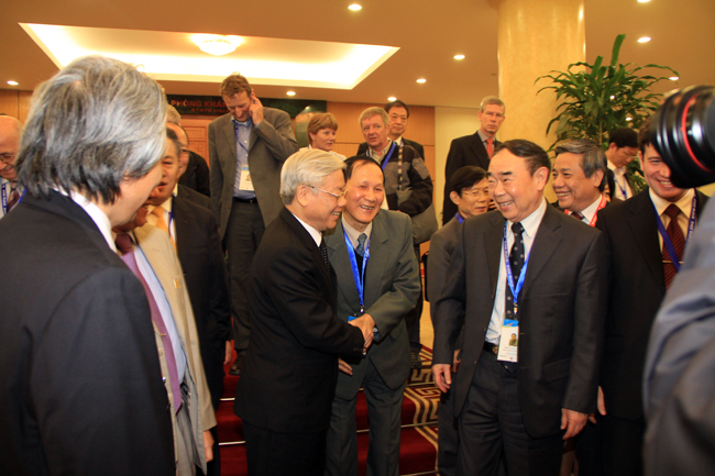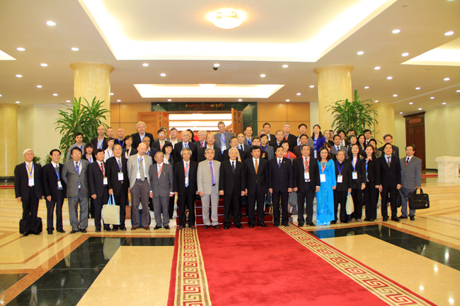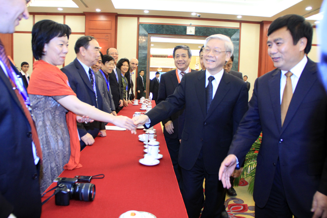 Tổng Bí thư Nguyễn Phú Trọng nhiệt liệt hoan nghênh các học giả tham dự Hội thảo, đánh giá cao ý nghĩa và thành công của hội thảo với sự tham gia đông đảo các nhà nghiên cứu, các học giả quốc tế đã dành nhiều tâm huyết và công sức để nghiên cứu về Việt Nam. Các tham luận đa dạng và sâu sắc về các lĩnh vực của các học giả và nhà nghiên cứu uy tín về Việt Nam học trong và ngoài nước cho thấy sự quan tâm đặc biệt và sự ủng hộ quý báu của giới khoa học và dư luận quốc tế đối với Việt Nam. Tổng Bí thư chân thành cảm ơn các ý kiến đóng góp thẳng thắn, sâu sắc của các đại biểu về con đường phát triển của Việt Nam, giúp nhân dân và bạn bè quốc tế hiểu thêm về công cuộc đổi mới, về lịch sử, văn hoá, về đất nước, về con người Việt Nam; khẳng định trong quá trình phát triển của mình, Việt Nam luôn trân trọng các ý kiến, đánh giá khách quan và sự tham gia tích cực của giới khoa học vào quá trình hoạch định và thực thi chính sách phát triển đất nước.