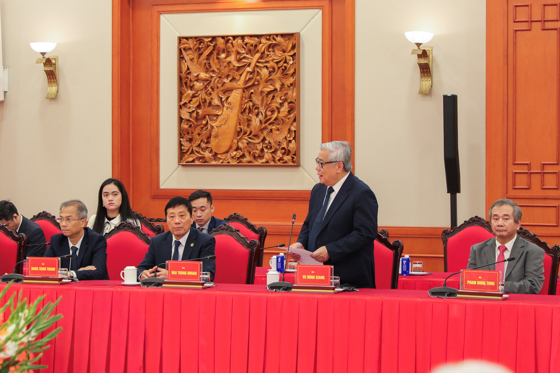 | GS.TSKH Vũ Minh Giang, Chủ tịch Hội đồng Khoa học & Đào tạo ĐHQGHN cho rằng sự hiện diện của Tổng Bí thư tại buổi gặp là dấu mốc đặc biệt, thể hiện sự trân trọng của Đảng đối với tri thức và học thuật |