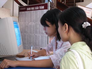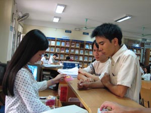 Sinh viên đang làm thủ tục mượn sách tại Thư viện Thượng Đình - ĐHQGHN. |