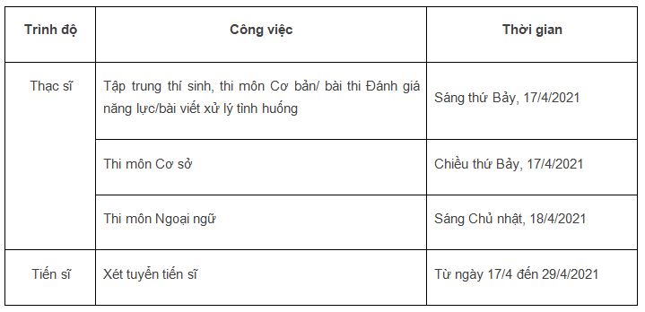 Đợt 1 thi tuyển vào các ngày 17 và 18/04/2021, tổ chức đánh giá hồ sơ chuyên môn (tuyển sinh đào tạo tiến sĩ) từ ngày 17/4 đến 29/04/2021.