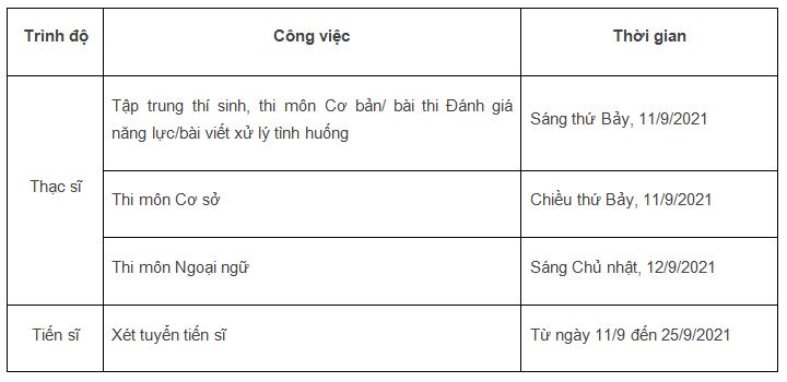 Đợt 2 thi tuyển vào các ngày 11 và 12/9/2021, tổ chức đánh giá hồ sơ chuyên môn (tuyển sinh đào tạo tiến sĩ) từ ngày 11/9 đến 25/9/2021.