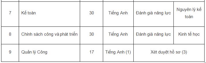 (1) Thí sinh dự thi chuyên ngành Quản trị các tổ chức tài chính, Quản lý công phải nộp minh chứng về năng lực ngoại ngữ theo yêu cầu của chương trình đào tạo tại thời điểm nộp hồ sơ đăng ký dự tuyển. Nếu tại thời điểm xét tuyển, thí sinh chưa nộp được minh chứng về trình độ ngoại ngữ, HĐTS SĐH có thể cho phép thí sinh cam đoan sẽ nộp trước thời điểm công nhận học viên, đồng thời đánh giá năng lực ngoại ngữ của ứng viên theo yêu cầu của chương trình đào tạo trong quá trình phỏng vấn. Môn thi cơ bản và cơ sở được thay thế bằng kết quả đánh giá hồ sơ và bài phỏng vấn. Một số chương trình có thêm bài kiểm tra một số năng lực cần thiết của thí sinh (năng lực viết luận, năng lực toán… tùy theo từng chương trình đào tạo).