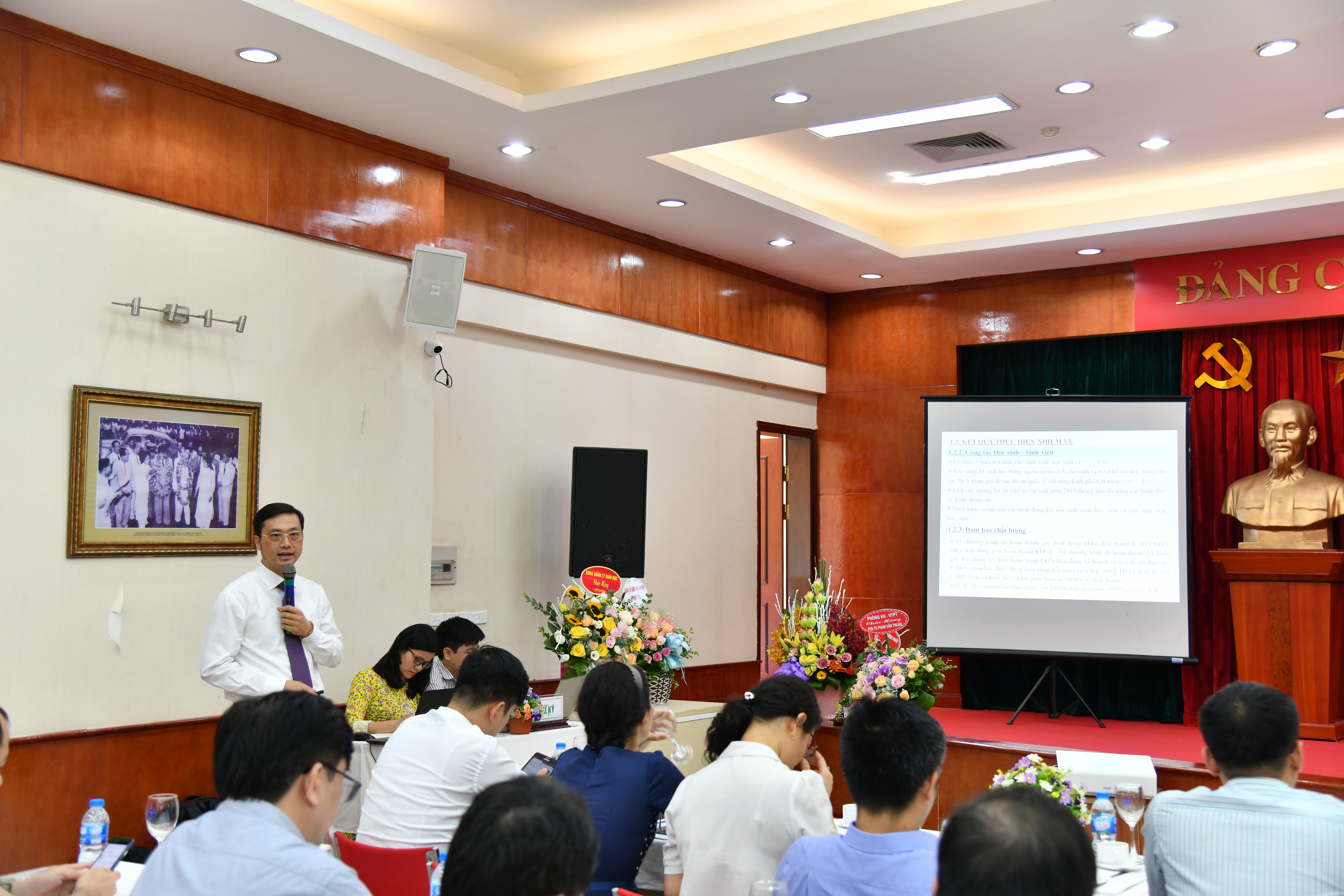 Phó hiệu trưởng Phạm Văn Thuần trình bày báo cáo tổng kết năm học và kế hoạch triển khai nhiệm vụ trong năm học mới
