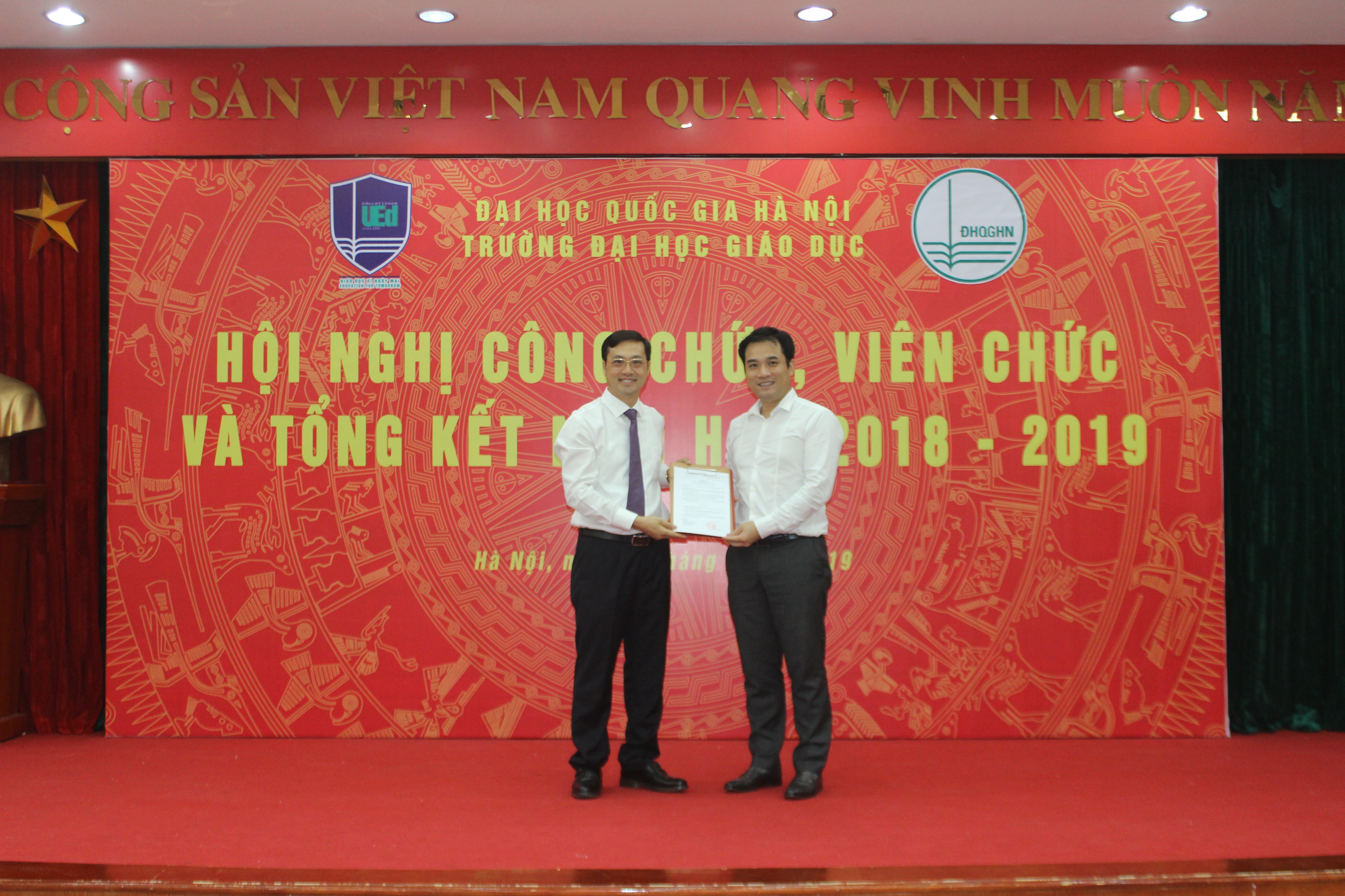 Phó Giám đốc ĐHQGHN Phạm Bảo Sơn trao quyết định bổ nhiệm lại chức vụ Phó hiệu trưởng Trường ĐHGD cho PGS.TS Phạm Văn Thuần nhiệm kỳ 2019 -2021