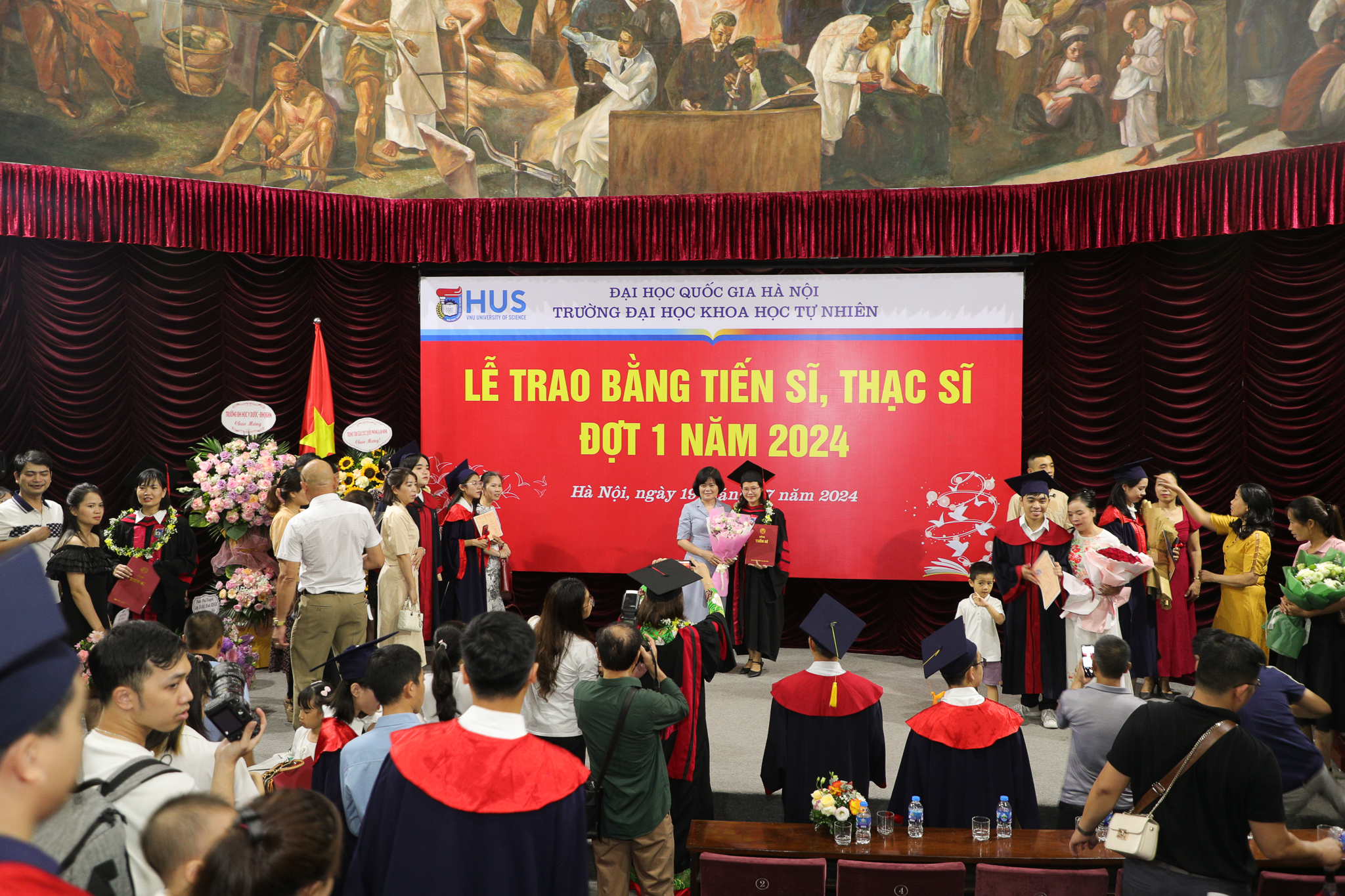 Trong những thành công của Nhà trường trong thời gian qua, công tác đào tạo sau đại học của Nhà trường đóng góp 1 vai trò quan trọng. Trong quá trình đào tạo, 10 nghiên cứu sinh nhận bằng tiến sĩ ngày hôm nay, đã công bố 53 bài báo khoa học trên các tạp chí khoa học uy tín, trong đó có 21 bài ISI/Scopus. Tỉ lệ học viên cao học tốt nghiệp đúng hạn có công bố khoa học trung bình chiếm 71%, trong đó có một số khoa tỉ lệ này lên tới 95-100%. Nhiều học viên cao học vừa tốt nghiệp đã tiếp tục được nhận học bổng du học tại các trường đại học lớn ở Mỹ, châu Âu, Nhật Bản, Hàn Quốc, … Đặc biệt, trong số các tân tiến sĩ tốt nghiệp có 2 lưu học sinh người nước ngoài đã chọn Trường ĐH Khoa học Tự nhiên là cơ sở đại học ở Việt Nam để học tập. Đó là học viên Changyoung Lee đến từ Viện Nghiên cứu KH&CN Sinh học Hàn Quốc và học viên Viengthong Xayavong đến từ ĐHQG Lào - Hiệu trưởng Trường ĐH Khoa học Tự nhiên, GS.TSKH Vũ Hoàng Linh chia sẻ.